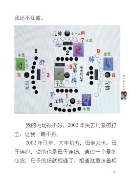 我还不知道。 我的内场很不好,2002 年失去母亲的打 击,让我一蹶不振。 2002 年马年,大年初五,母亲去世。母 子连心,说的也是母子连场,通过一个爱的 心念,母子的场就相通了。相通就意味着相 107