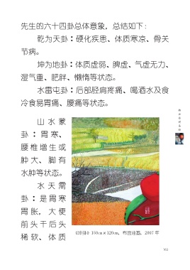 先生的六十四卦总体意象,总结如下: 乾为天卦∶硬化疾患、体质寒凉、骨关 节病。 坤为地卦∶体质虚弱、脾虚、气虚无力、 湿气重、肥胖、懒惰等状态。 水雷屯卦∶后部胫肩疼痛、喝酒水及食 冷食易胃痛、腰痛等状态。 山水蒙 卦∶胃寒、 腰椎增生或 肿大、脚有 水肿等状态。 水天需 卦∶是胃寒 胃胀,大便 前头干后头 《坤卦》150cm×120cm,布面油画,2007 年 稀软、体质 163