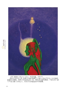 《天门脱胎》200cm×150cm,布面油画,2009 年 那长生的天地之炁,虽然可以通过胎息引入体内,但由于后天人生的消耗, 能修补也勉强。肉体中存放的先天一炁,再充沛也是有限的,不如在天门这 个产道让真人自由出入,回到天母那里直接采取能量。 272