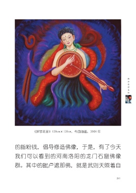 ........《弹琴观音》120cm×120cm,布面油画,2006 年 .. 的脂粉钱,倡导修造佛像,于是,有了今天 我们可以看到的河南洛阳的龙门石窟佛像 群。其中的毗卢遮那佛,就是武则天照着自 291