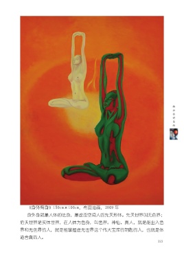 《身外有身》150cm×100cm,布面油画,2009 年 身外身就是人体的法身,是虚态空间人的先天形体。先天世界叫无色界; 后天世界是实体世界,在人体为色身,叫色界。神仙、真人,就是能出入色 界和无色界的人,就是能掌握虚无世界这个伟大宝库的钥匙的人,也就是体 道合真的人。 323