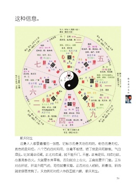 这种信息。 顺天则生 这是人人都要看懂的一张图,它标示的是天地的阴阳,粉色的是阳位, 黄色的是阴位。八个方向四对阴阳,丝毫不能错,错了就是阴阳颠倒,气血 混乱。比如肾必须藏,正北对应肾,就不能开门、开窗。正南是阴,对应心脏, 心是离卦的火。火就要水来平衡,否则就会上心火,正南就要开门窗。正东 对应肝脏,肝是升阳气的,阳位就要实墙。正西对应人的肺,肺要凉,肺热 就是感冒发烧了。天地阴阳对应人体的五脏六腑,顺天则生。 79